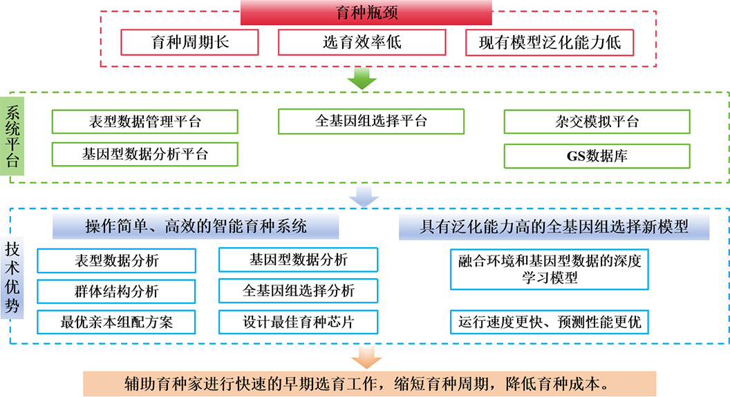 为解决作物在杂交育种中早期材料选育效率低,以及现有基因组预测模型泛化能力低的问题,三亚华大生命科学研究院基于农业大数据,开发了大数据智能育种系统。目前,智数生物已将该系统部署在崖州湾科技城先进计算中心上,育种家可通过访问网站(http://59.50.39.12:8090/),创建育种项目,上传相关基因型-表型数据,在网页上实现表型预测、育种材料筛选。