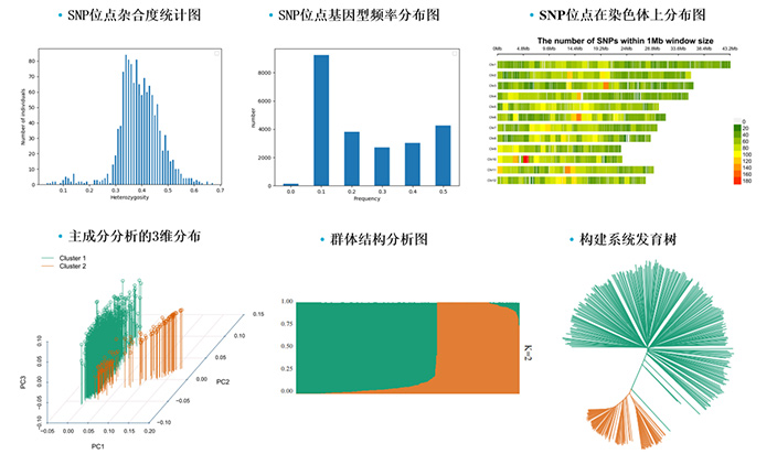 基于基因型数据,统计SNP杂合度、基因型频率以及在不同染色体上分布密度,同时对基因数据进行主成分和群体结构分析,可以帮助用户确认样本分组是否符合预期以及检测离群样本。