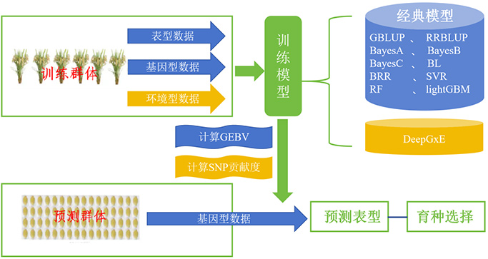 注:蓝色代表10种经典模型结合表型和基因数据进行训练计算GEBV,黄色表示AI模型DeepGxE结合表型、基因型和环境型数据进行模型计算SNP贡献度。