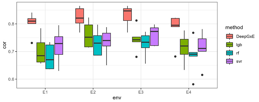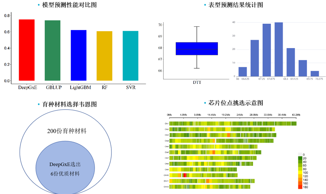 育种家可灵活选择自主训练,进行表型预测、育种材料选择和育种芯片位点的挑选。在多个作物上对该模型进行基准测试,结果表明,与经典的基因组预测模型比较,DeepGxE模型运行速度更快、预测性能更高、泛化性能更高。