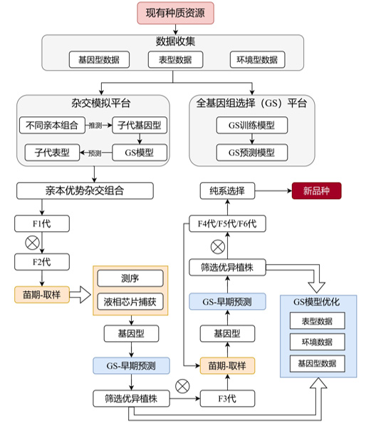 该平台根据亲本遗传信息对后代基因型进行大规模数字模拟,结合亲本数据训练好的GS模型预测后代的表型值,从而计算加权育种值,推荐最优的亲本组配方式。