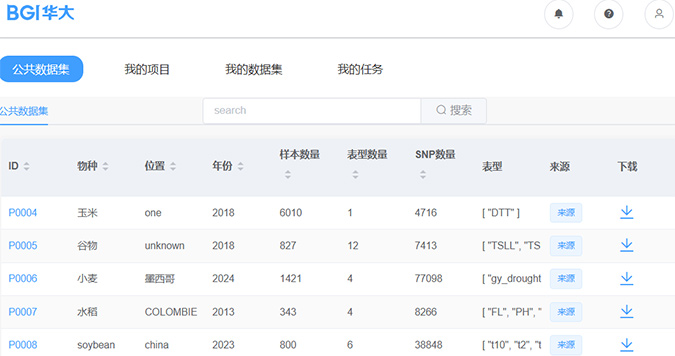 GS数据库包含水稻、玉米、小麦和大豆等主要作物的基因型与表型信息的综合性资源库。收集了已发表文章的数据,涵盖了不同性状的信息。这一数据库为植物育种家提供了一个宝贵的资源,使他们能够方便地测试和训练遗传学模型,从而在作物改良和育种策略中做出更加科学和高效的决策。