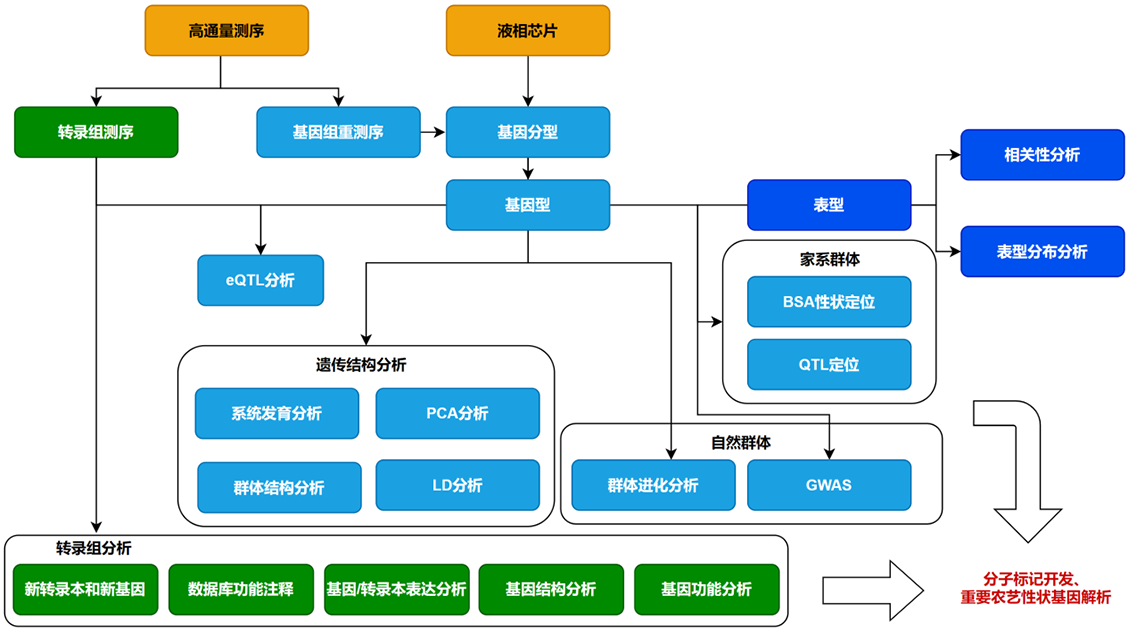 通过对群体或个体多组学数据进行分析,揭示不同个体基因组存在的遗传变异和重要生物学过程的分子调控机制,评估群体结构和遗传多样性,获得与目标性状关联的基因和分子标记。