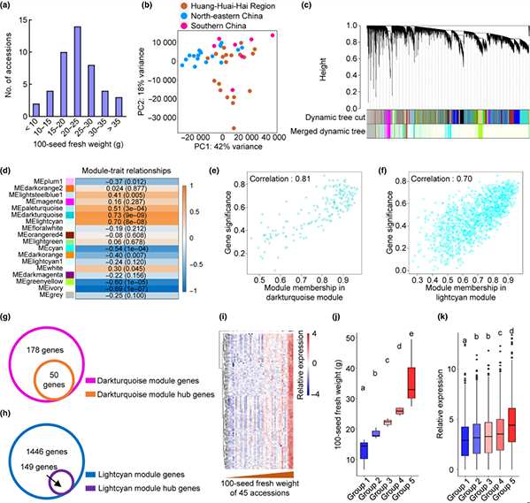 转录组测序和权重基因共表达网络分析(Weighted correlation network analysis,WGCNA)鉴定大豆种子大小和重量相关的基因。