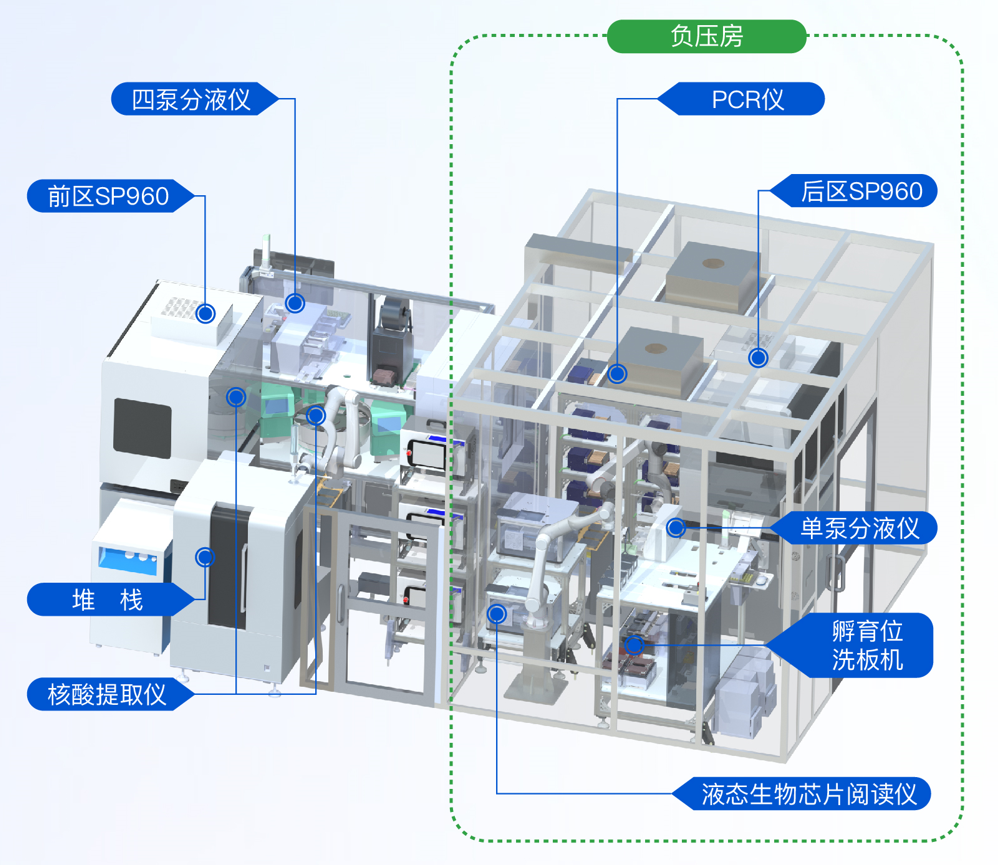 该自动化基因分型系统基于实验室自动化产线整合系统,集成了微孔板转移机器人,全自动核酸提取纯化仪,高通量自动化样本制备系统,PCR仪,微孔板储板器,加热振荡模块,微孔板撕膜机,自动洗板机和高通量液体生物芯片阅读仪等设备。