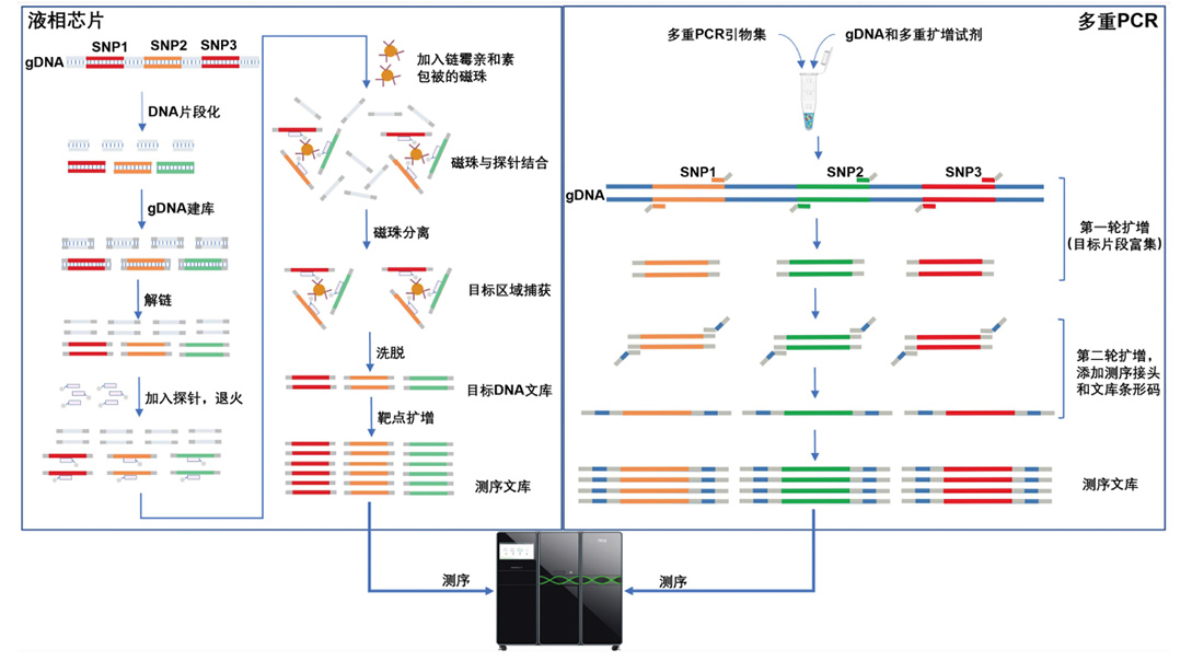 液相芯片就是用于捕获特定位点或区域DNA片段的“捕获试剂盒”,在捕获完成后,仍需通过短读长测序来进一步获得目标区域的基因型。相比于全基因组重测序,靶向序列捕获试剂盒能够通过有的放矢地捕获住目标区域位点,从而降低测序量,大大简化了生物信息分析和数据处理。