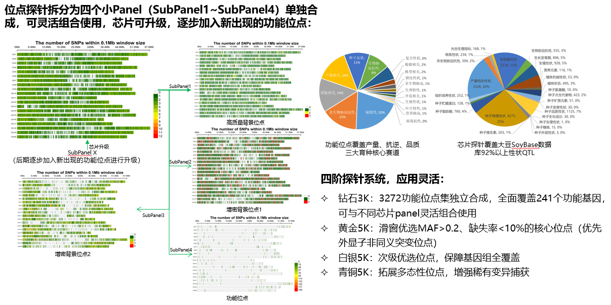 在海南省种业实验室联合揭榜挂帅项目的支持下,三亚华大生命科学研究院联合南京农业大学开发大豆15K液相育种芯片,智数生物和华大新一产承担了芯片设计、探针合成和测试等工作。该芯片基于 1850 份大豆种质资源(涵盖野生种、地方品种及国际主栽种),凭借118,464个高多态性SNP位点均匀覆盖基因组近70%外显子区域,精准锚定551个产量、抗逆及品质功能位点,推动育种模式从“大海捞针”迈向“精准导航”。