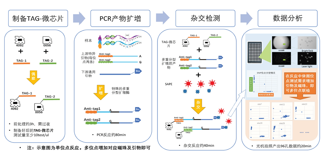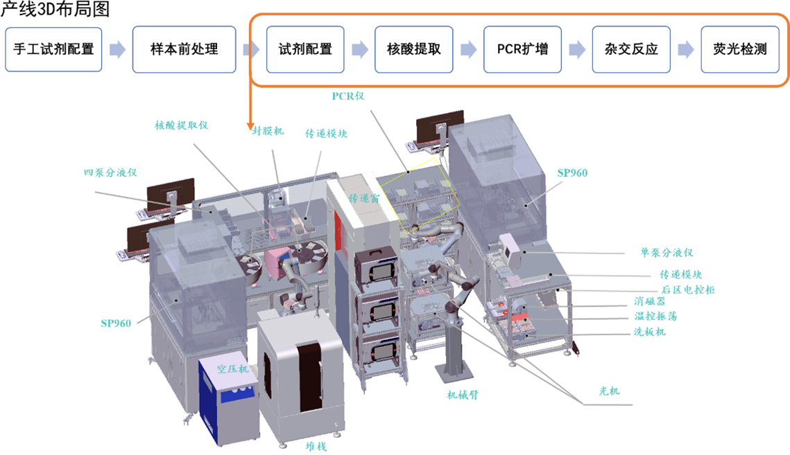 该自动化基因分型系统基于实验室自动化产线整合系统,集成了微孔板转移机器人,全自动核酸提取纯化仪,高通量自动化样本制备系统,PCR仪,微孔板储板器,加热振荡模块,微孔板撕膜机,自动洗板机和高通量液体生物芯片阅读仪等设备。